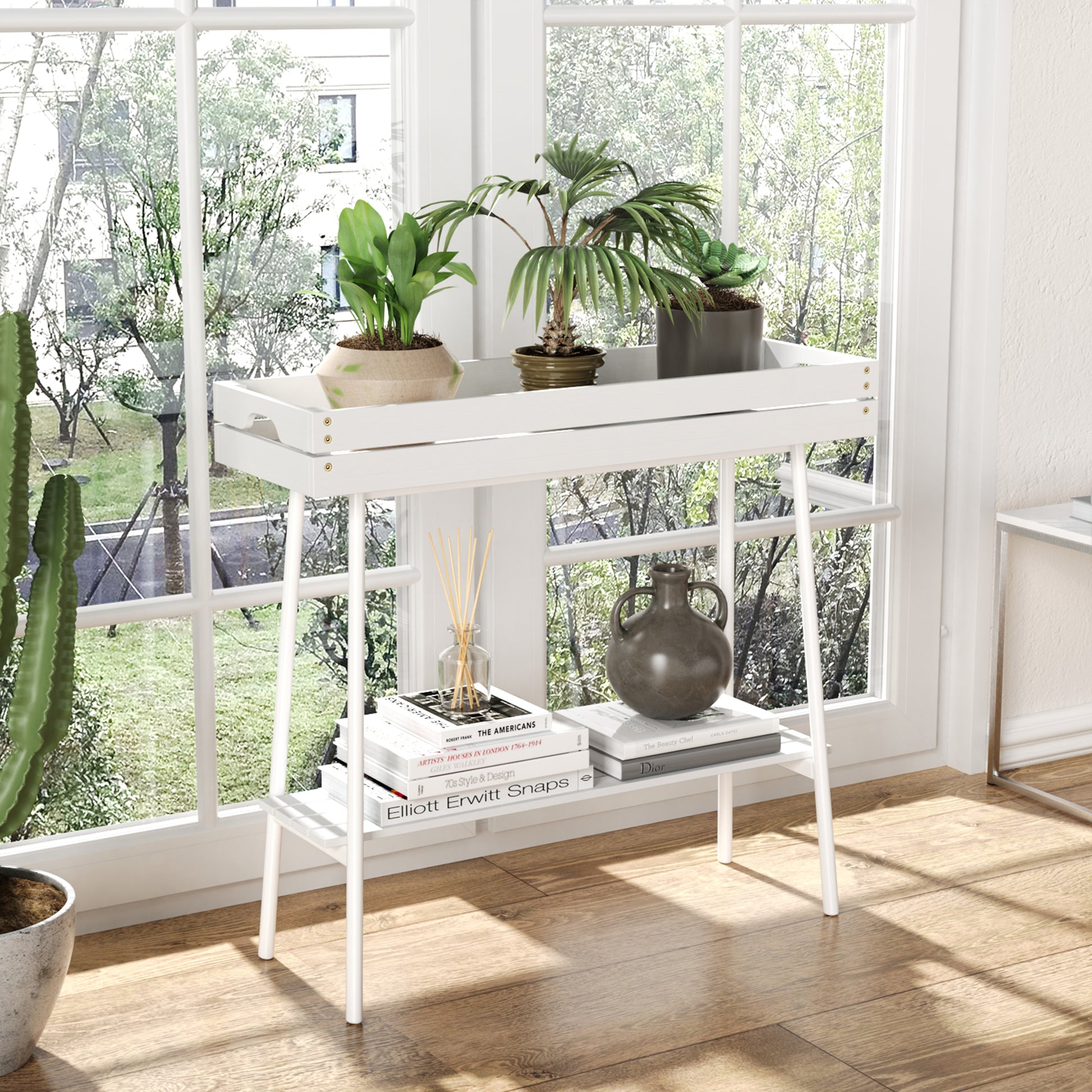 - Space-Saving Vertical Design Maximize your space with our 2-tier plant stand that makes excellent use of vertical space. Its compact footprint is ideal for small areas, and the layered design allows your plants to receive optimal sunlight exposure. The window plant stand is perfect for showcasing your favorite flowers, succulents, or herbs in any corner, bedroom, office, balcony, or terrace.