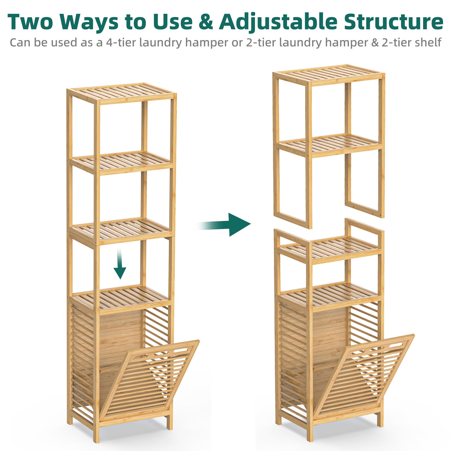 - Two-in-One Design: The 4-tier pull-out clothes hamper features an enhanced structure, providing dual functionality as shelves and bins. It can transform into a 2-shelf laundry hamper with 2-tier shelving unit, offering convenient separate use as required