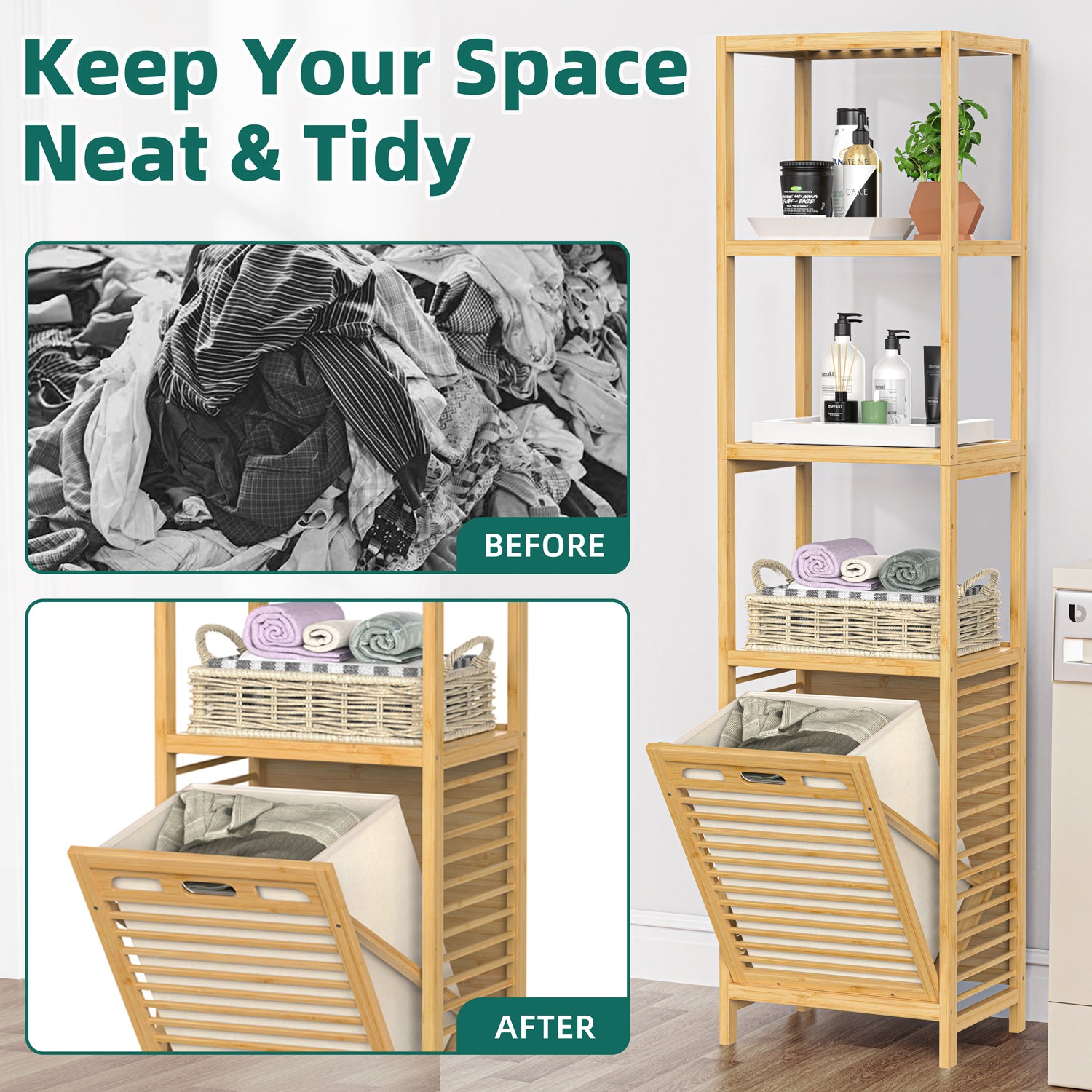 - Tilt-Out & Handle Design: The 4-tier laundry bins with shelf's tilt-out & handle design allows for effortless use. Pull out clothes with a slight bend and easily lift to clean the bottom. The back features a whole bamboo panel to block dust effectively