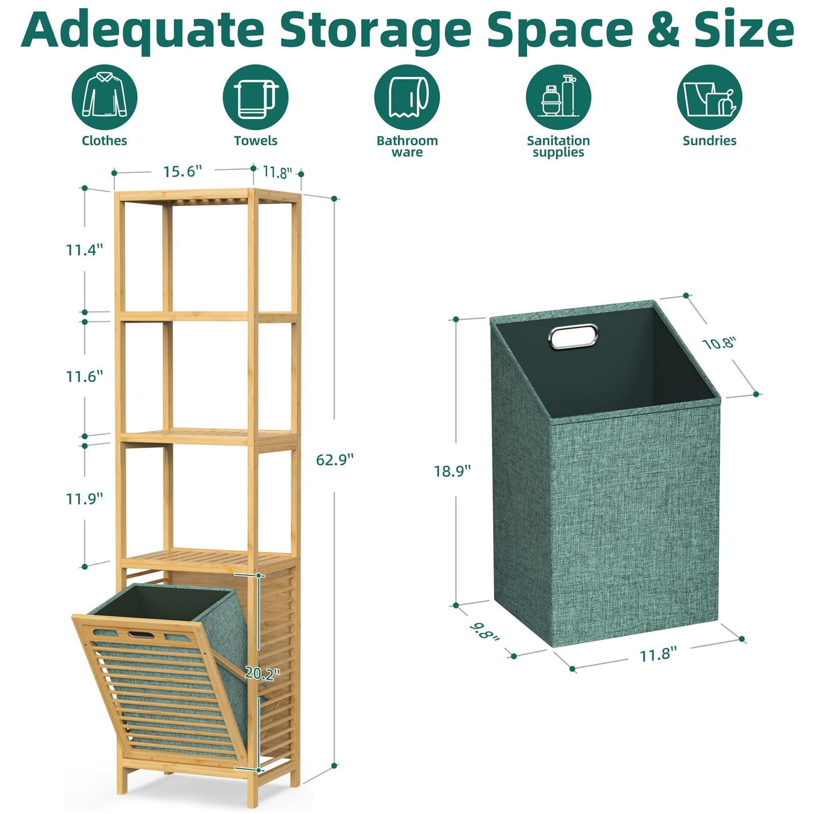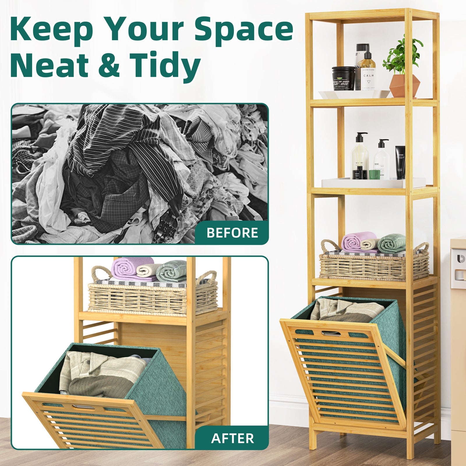 4-tier Bamboo Tilt-out Cabinet Laundry Hamper With Basket, Shelves (Green Bag)