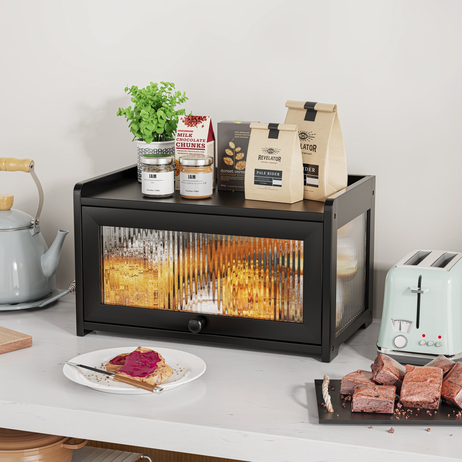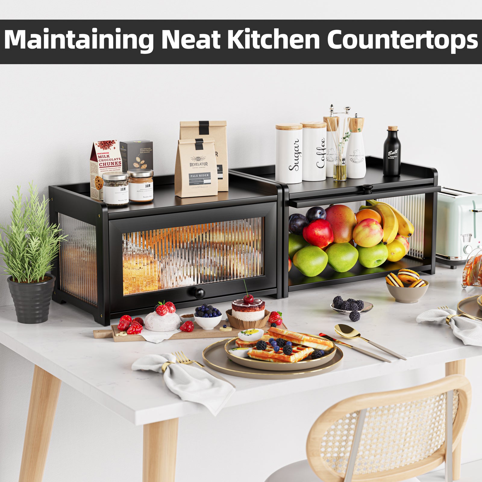 - LARGE CAPACITY BREADBOX: While other bread box can only hold 1 loaf of bread, our 16.53" L x 9.84" W x 9.64" H bread box is large enough to hold normal-size bread, rolls, muffins and other baked goods, which will avoid effectively deformation of bread caused by extrusion.