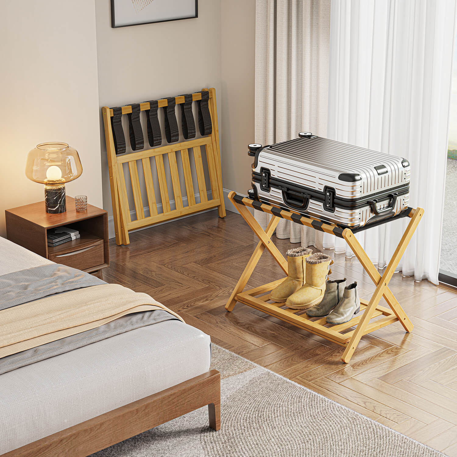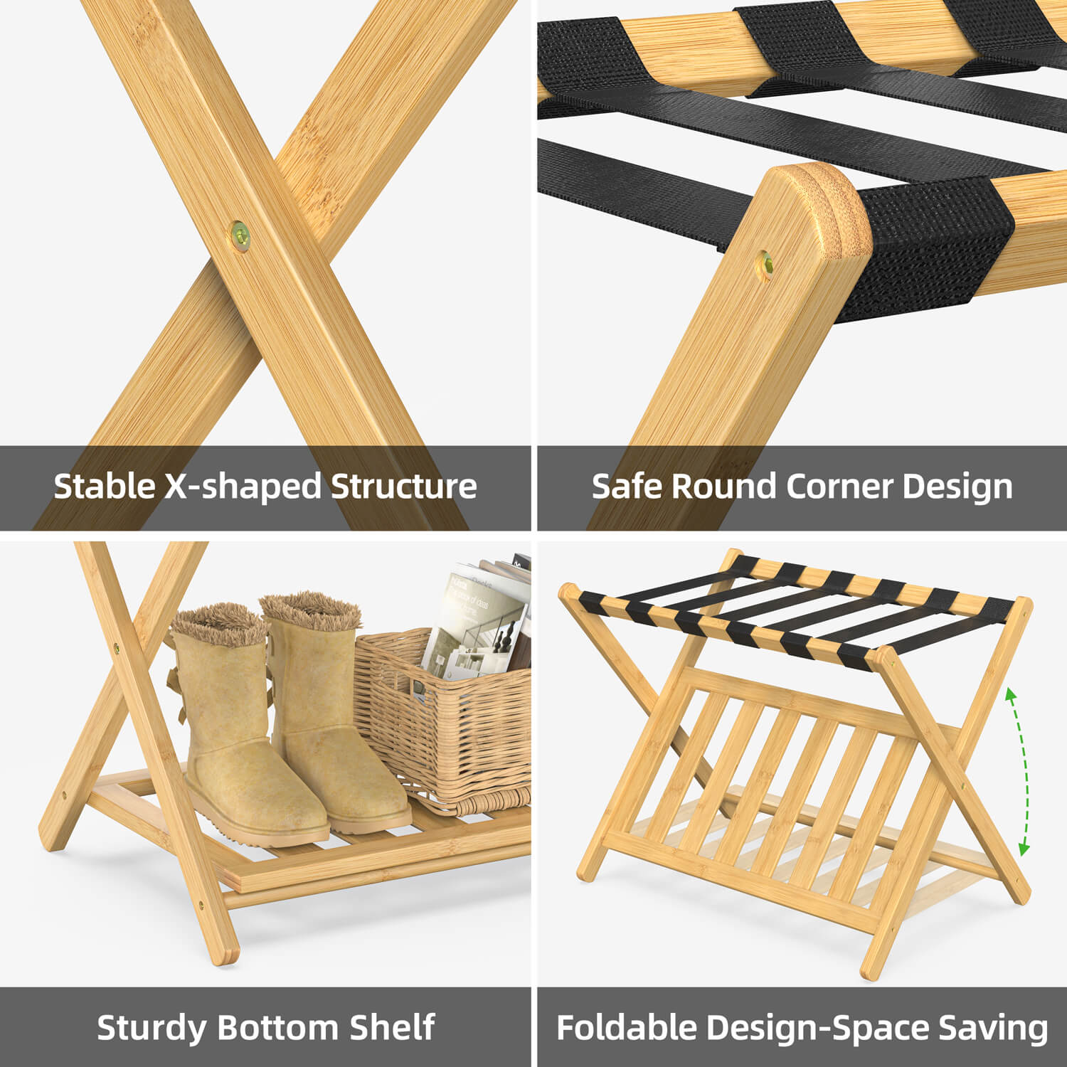 - 【Three colors】- This luggage rack comes in three colors: natural, white and black. You can choose the right color according to your home decoration style.