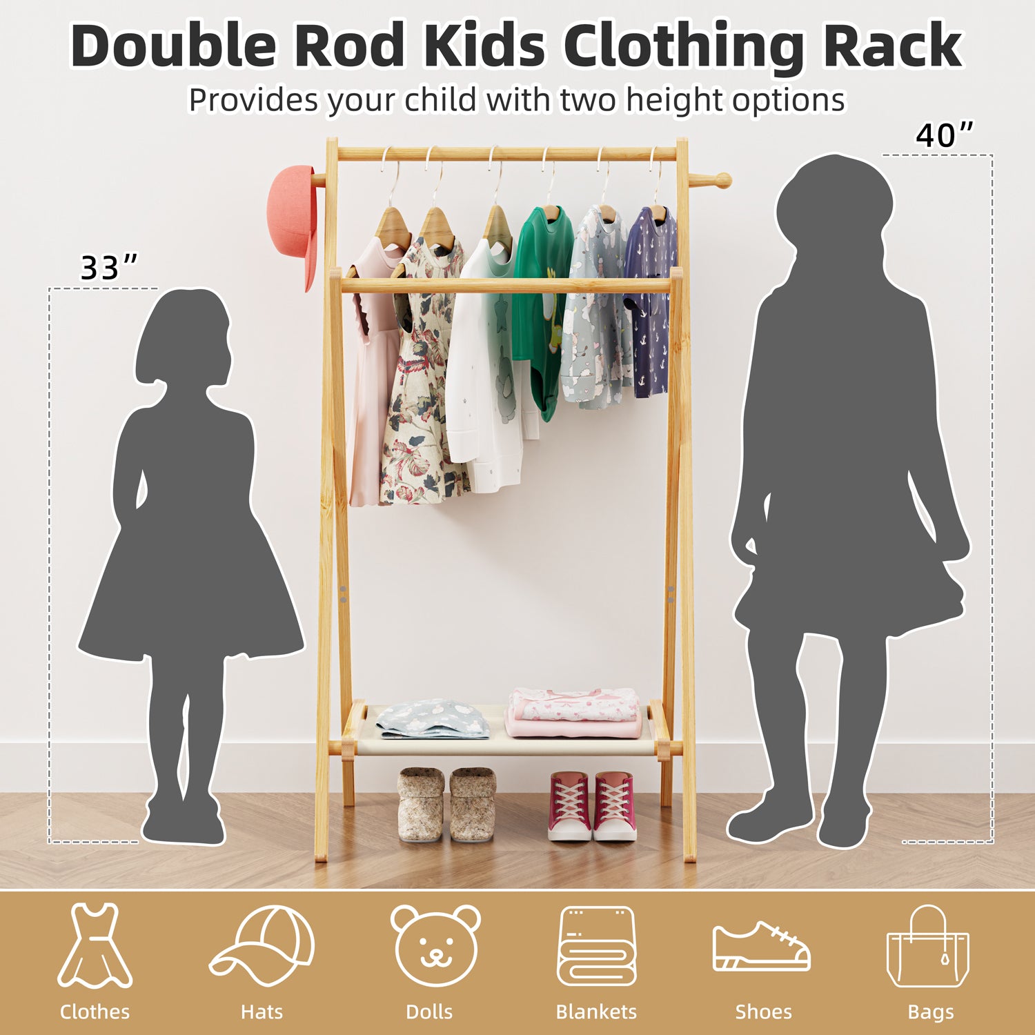 - DOUBLE ROD DESIGN: The double rod design allows you to hang different lengths and types of clothes while providing your child with two options. The sturdy canvas shelf on the bottom can be used to store shoes, dolls, toys, or storage boxes. It will be a practical clothing rack and a perfect decorative rack.