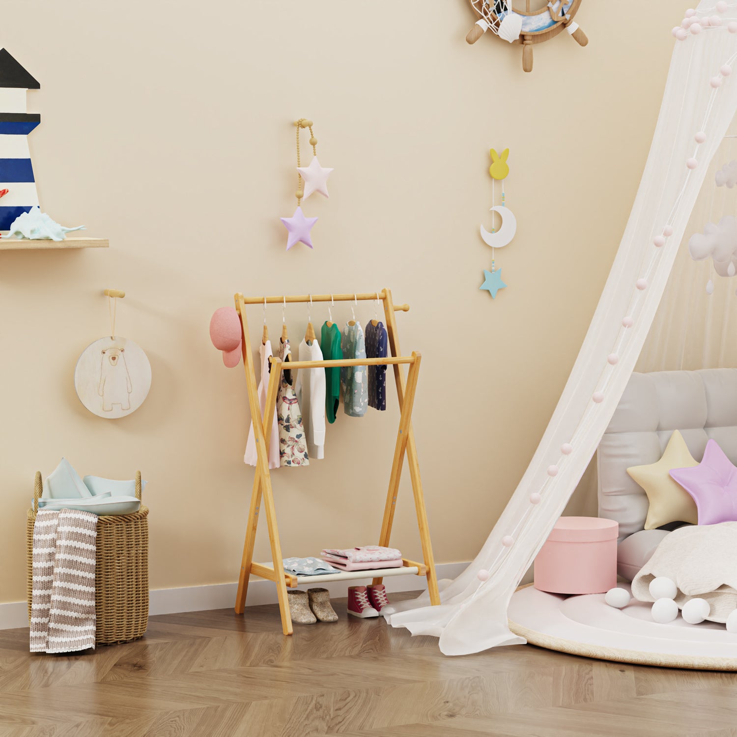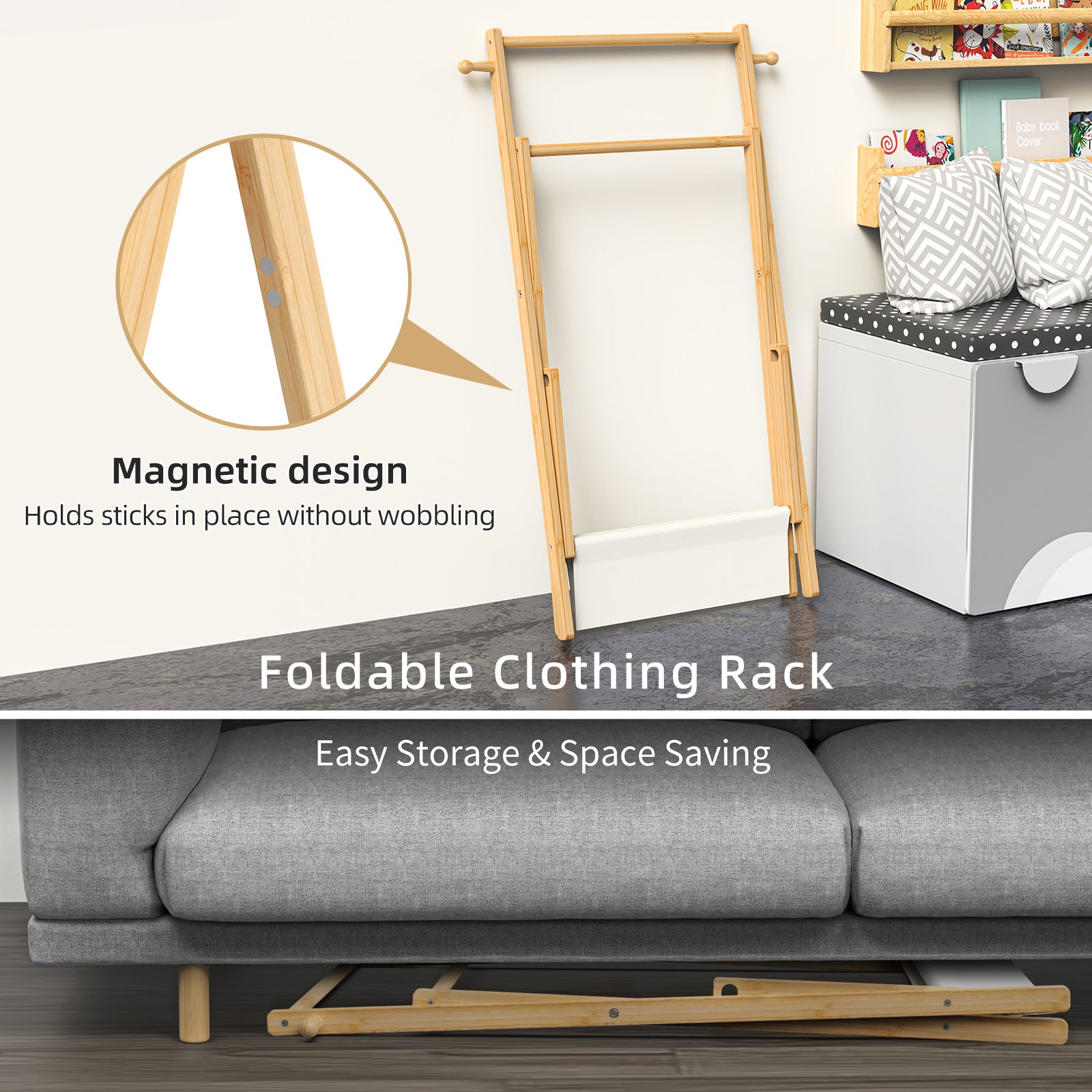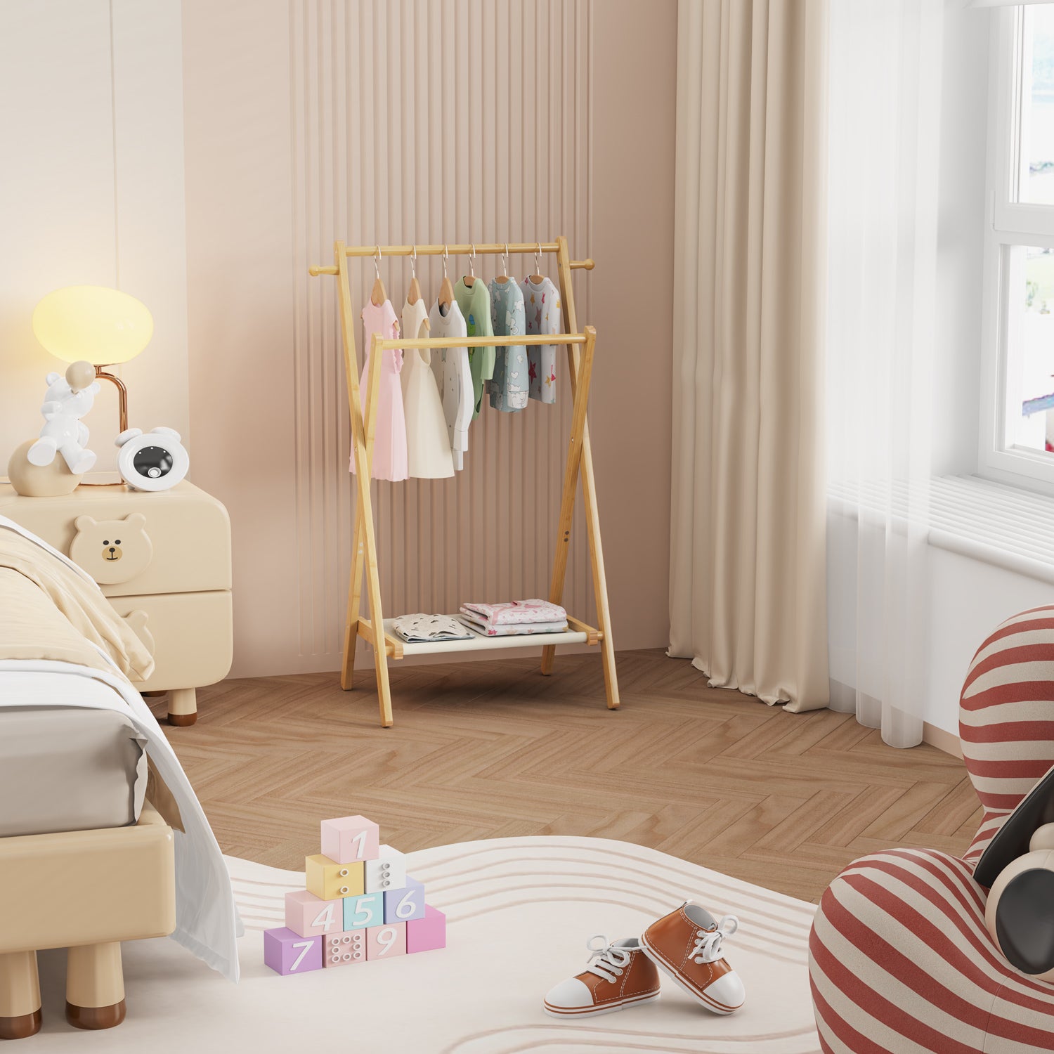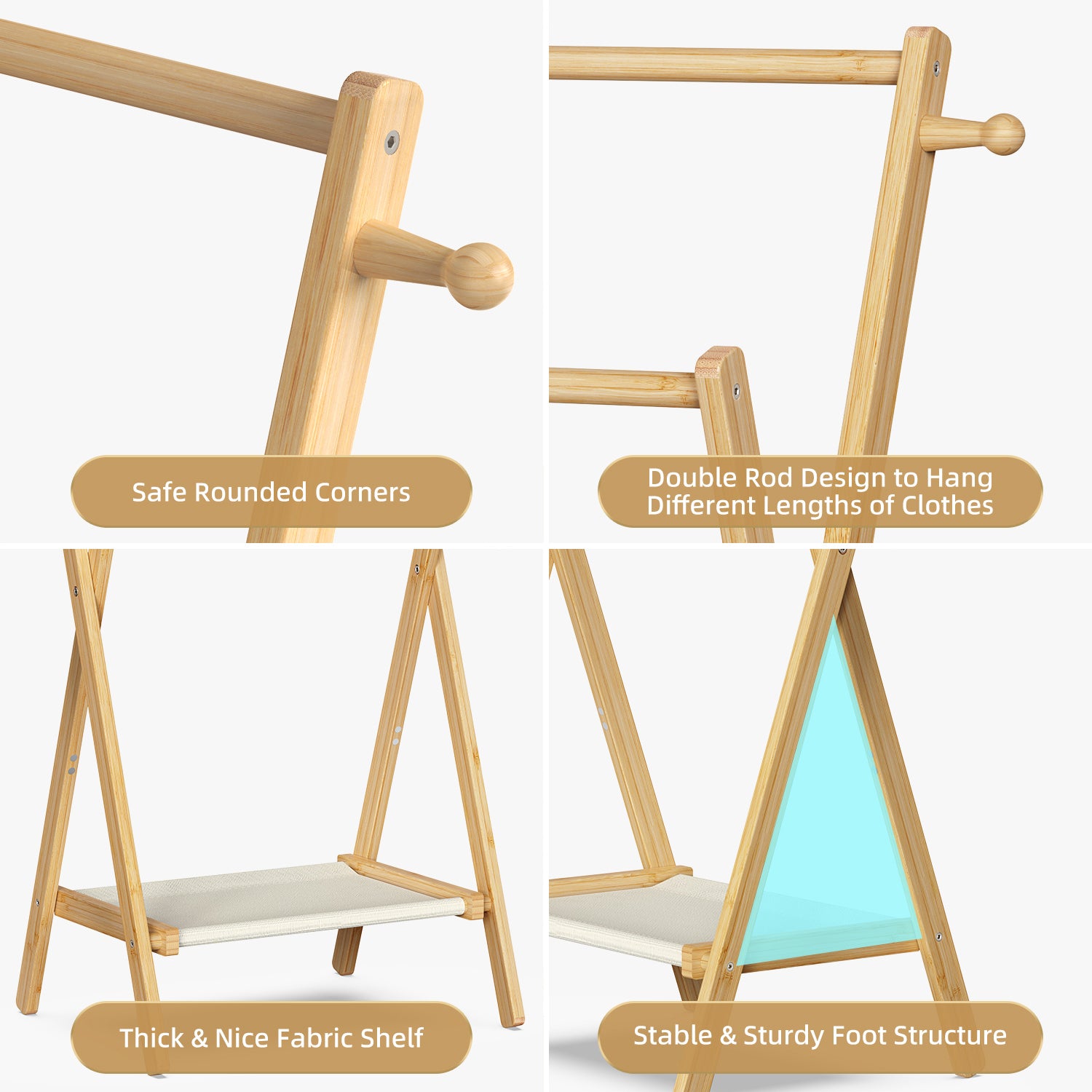 - STURDY & DURABLE: This kids clothing rack is Made of 100% high-quality solid bamboo, durable and strong, it has been finely polished to make the surface smooth. The natural color well matches any room decor. The stable triangular structure makes it stand firm and prevents it from tipping over.