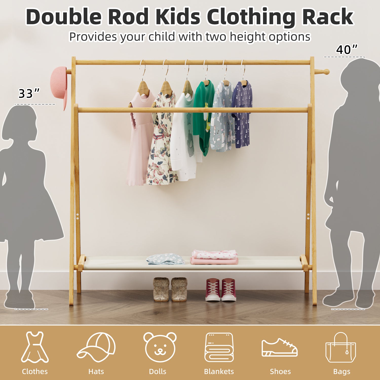 - Double rod design - The double rod design allows you to hang different lengths and types of clothes while providing your child with two options. The sturdy canvas shelf on the bottom can be used to store shoes, dolls, toys, or storage boxes. It will be a practical clothing rack and a perfect decorative rack.
