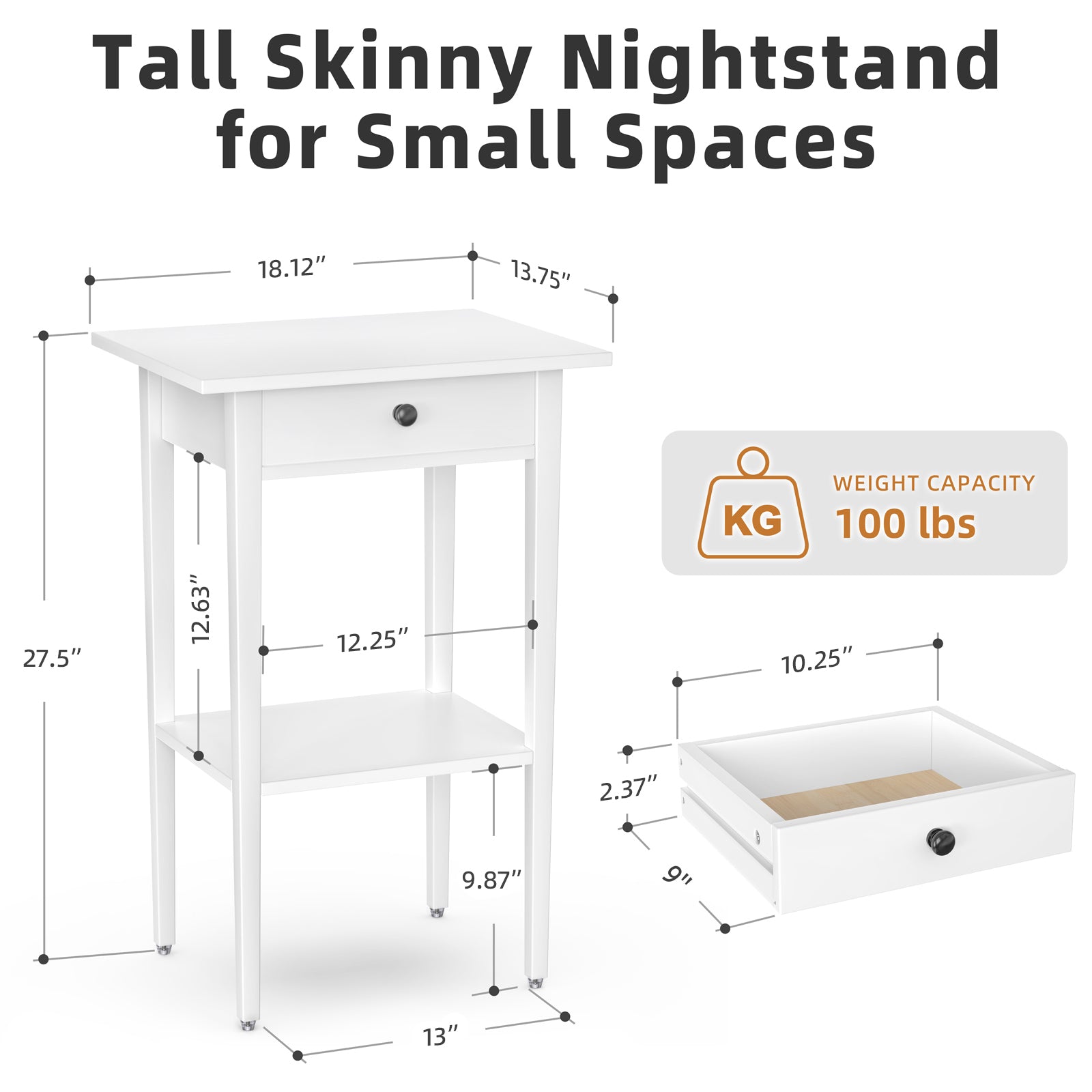 | 【Unique Design】This tall skinny nightstand will be the most dazzling artwork in your home! We use a special process method so that no screws or holes can be seen on its exterior. The special leg design combined with the elegant small drawer creates a unique look, brings a perfect visual effect to your home. It is not only practical furniture but also an iconic decorative piece, blending perfectly with home décor while enhancing the overall beauty of your space. 【Exquisite Craftsmanship】This modern nightstand is made with 100% high-quality bamboo, which is sturdy, eco-friendly, and chemical-free. Finely polished for a smooth surface, it combines aesthetic beauty with great practicality. The wooden knob handle helps you easily control the drawer. Special rotatable stopper design blocks the drawer and prevents it from falling off. The transparent anti-slip feet enhance stability while protecting floors from scratches. 【Perfect for Small Spaces】This tall narrow nightstand is designed to fit in compact living spaces. The versatile size of 18.11"D x 13.78"W x 27.36"H allows you to make the most of your available space without sacrificing style or functionality. Perfect for limited spaces such as corners or narrow vacancies by the sofa or bed. 【Meets Various Storage Needs】This white nightstand with 2 open shelves and 1 drawer is enough to store your photos, books, lamps, mobile phones, remotes, water glass, and pens, while the small drawer offers private storage space. Perfect for use as a nightstand, bedside table, sofa table, or study printer bracket in a bedroom, dorm room, or living room with limited space. 【Easy Assembly】This bamboo night stand with drawer comes with all the required accessories and installation instructions. Just follow the instructions, and it will be assembled in 30 minutes. |